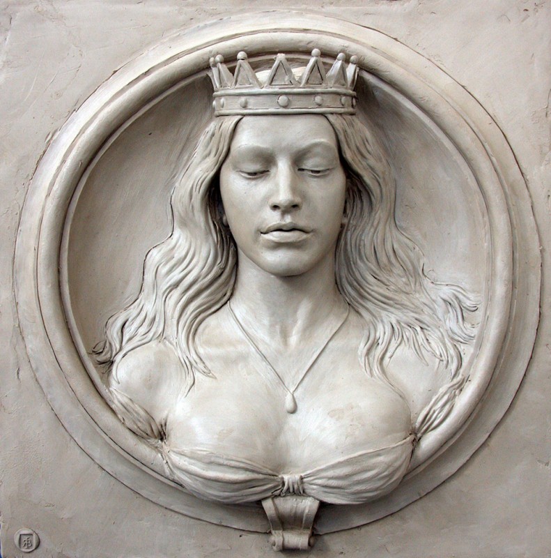 This roundel is a proposal for a new property mark for the Worshipful Company of Mercers’ in the City of London. The maiden in relief harks back to the roundels of the Renaissance artist Lucca Della Robbia. She is demure with her eyes downcast. The downcast gaze is appropriate as she will be looking at the observer from high up on a building. Her dishevelled locks fall about the flesh of her sensuous shoulders, and her modesty is maintained by a silk twist around the breasts. Maybe there are echoes of the modern Maiden in our attractive young addition to the Royal family, Katherine Duchess of Cambridge. The structure for this version is identical to Rank-Broadley’s effigy of Dean John Colet which can be viewed in St Paul’s Cathedral.