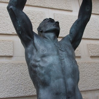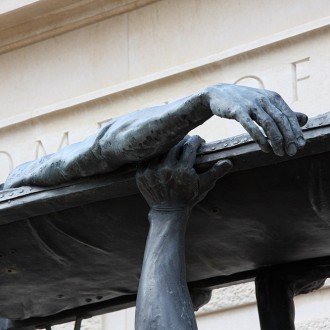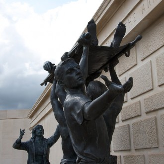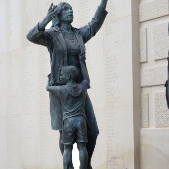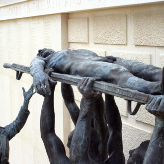 One of the two groups of sculpture at the centre of the AFM at the National Memorial Arboretum at Alrewas, near Lichfield, in Staffordshire. This group illustrates the loss and grief surrounding the mortal injury of a soldier. The imagery taken from classical mythology, is transposed to the modern world of warfare: the wounded and dying Patroclus carried back to camp on the shield of Achilles. The soldier, carried high above the heads of his comrades on a stretcher, is greeted by the distraught mother and child. He is mourned here also by his grieving parents.