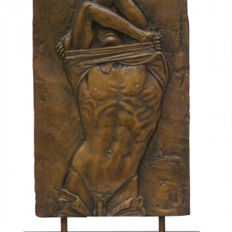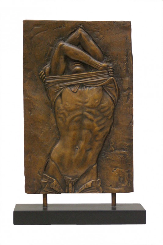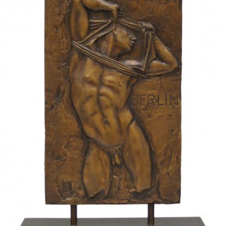 A torn page from a 1930’s book, showing a nude figure and a fragment of a German text inspired the relief panel for both of the Berlin Boys.