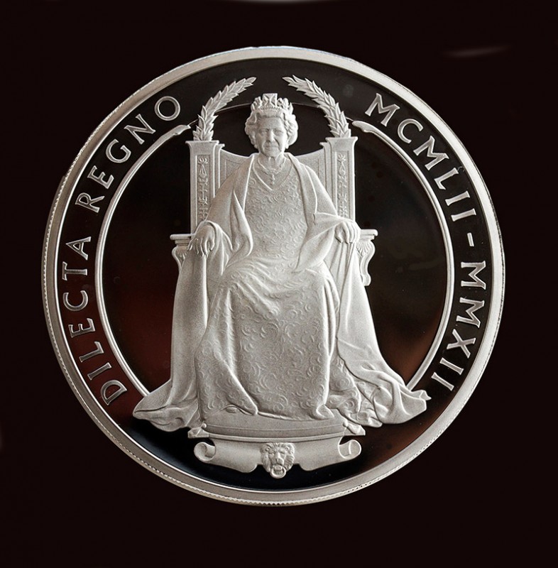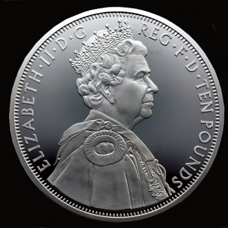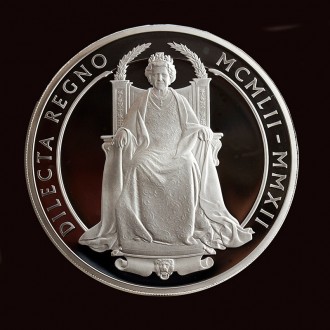 Struck by the Royal Mint to celebrate the Diamond Jubilee. The obverse shows HM Queen Elizabeth II in Garter Robes. The reverse shows the Monarch enthroned, inspired by the Great Seals of Queen Victoria. The latin inscription DILECTA REGNO translates as I Reign Beloved. The denomination is £10.