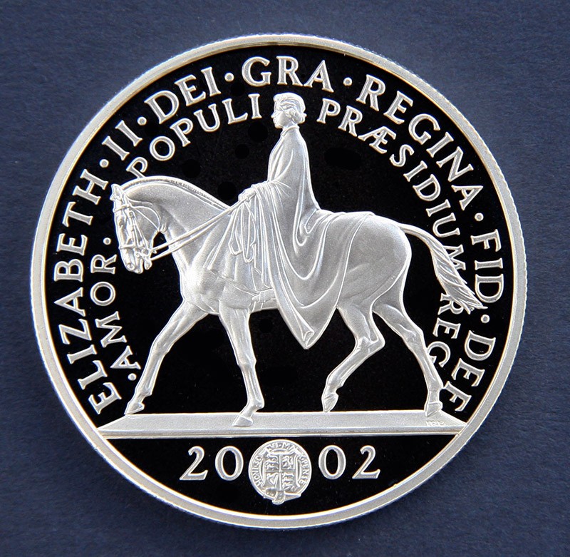 Issued by the Royal Mint 2002 to commemorate the Golden Jubilee of HM Queen Elizabeth II. The obverse equestrian design was based on a maquette for life size sculpture of Her Majesty. The reverse is the standard effigy, by the Artist as well, used on all UK and Commonwaelth coinage since 1998 .