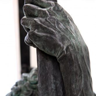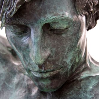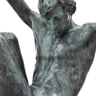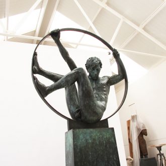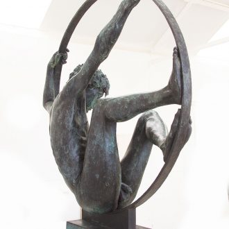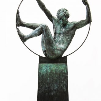 In ancient Greek myth and religion, Helios is the god and personification of the Sun. Although often depicted driving a horse-drawn chariot through the sky, this sculpture shows Helios within the geometry of the circle looking down on the Earth. Working from the original small maquette made twenty years earlier and using the same model, the life size sculpture was completed and cast in 2020.