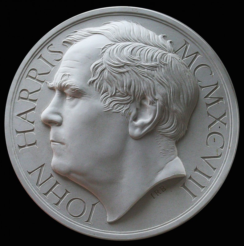 John Frederick Harris OBE (born 1931) is an English curator, historian of architecture, gardens and architectural drawings, and the author of more than 25 books and catalogues, and 200 articles. He is a Fellow and Curator Emeritus of the Drawings Collection of the Royal Institute of British Architects, founding Trustee of SAVE Britain’s Heritage and SAVE Europe’s Heritage, and founding member and Honorary Life President of the International Confederation of Architectural Museums. This uniface portrait plaque was presented to him in bronze at a reception at Bart’s Hospital 8th October 1998.