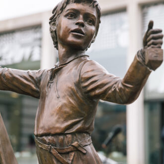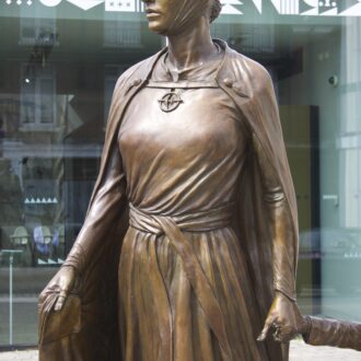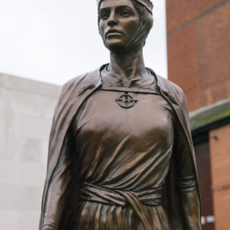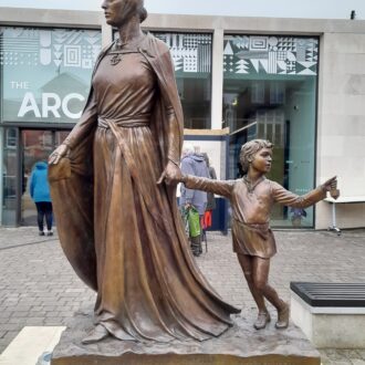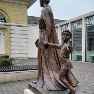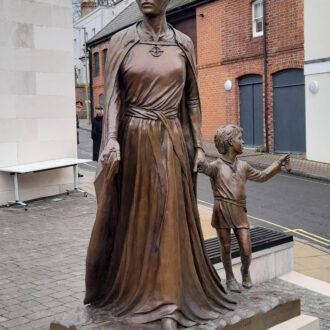 The sculpture shows Licoricia with her son, Asher.