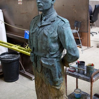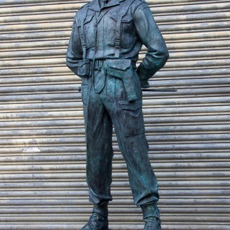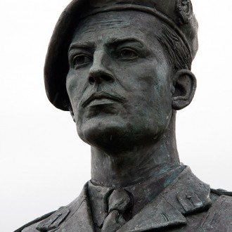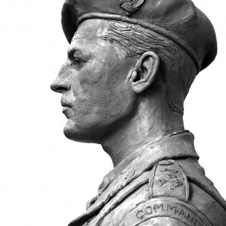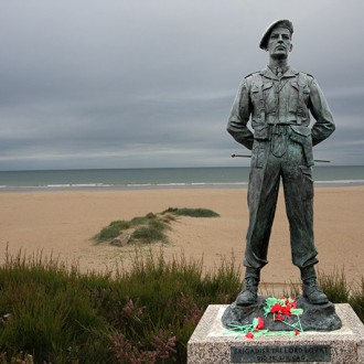 This sculpture was commissioned by the Fraser Family and Clan in memory of the men of the 1st Commando Brigade and stands near Sword Beach, Ouistreham, France.