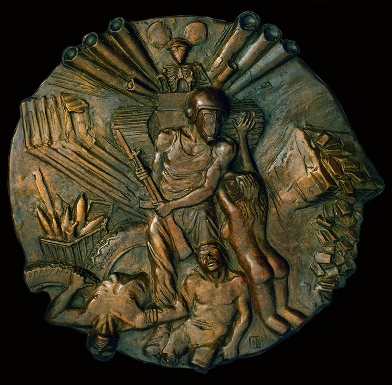 Part of a series ” The Perils of Existance ” that was never completed, the Evils of War illustrate the horrors of war. The iconic Mickey Mouse drives the machinery of war regardless of the human cost. Exhibited at the FIDEM exhibition at the British Museum in 1992.