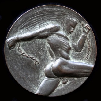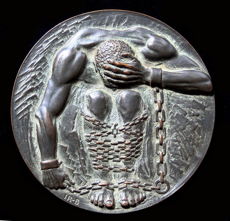The medal itself features a chained crouched figure in despair. A symbol not only of the universal fate of man cramped by his own lack of imagenation and damned by conscience, but also the particular plight of a few individuals whose bodies are torched for access to their minds.