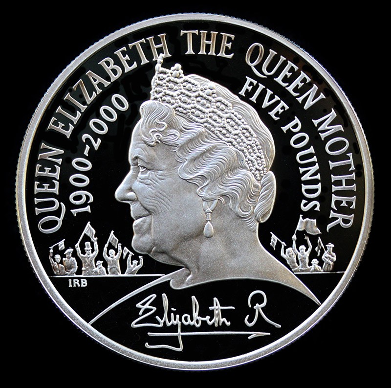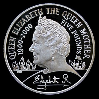 Queen Mother Centenary Crown Issued by the Royal Mint 2000 to celebrate the centenary of Queen Elizabeth The Queen Mother. The reverse bears the effigy of HM Queen by the Artist. Details:Material: Silver Size: 1.52" / 38.6 mm