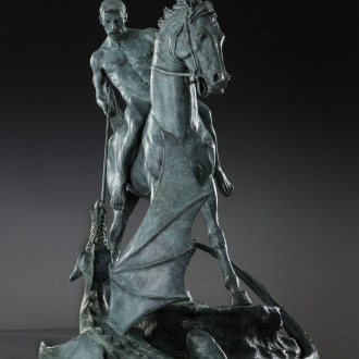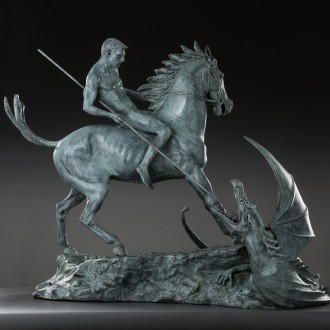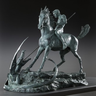 The image achieved iconic status with Benedetto Pistrucci’s rendition on the coinage of the United Kingdom in 1817 during the reign of George III. It is still used nearly two hundred years later. It is a point of interest to note that IRB is the sculptor of the effigy of Queen Elizabeth II on the present UK coinage and that his version of St George and the dragon could be considered as a worthy successor to Pistrucci’s famous image.
